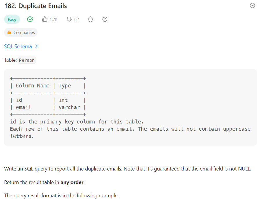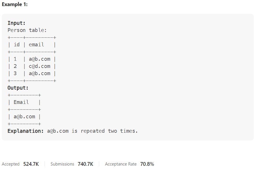 | 1 | MySQL Solution for Duplicate Emails Problem - Duplicate Emails - LeetCode | Aman_Raj_Sinha |