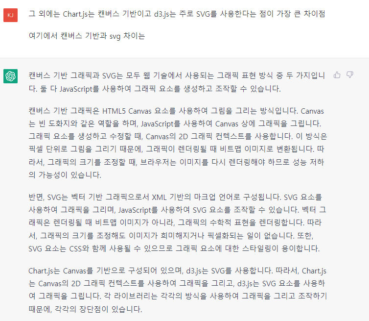 Chart.js는 Canvas를 기반으로 구성되어 있으며, d3.js는 SVG를 사용합니다. 따라서, Chart.js는 Canvas의 2D 그래픽 컨텍스트를 사용하여 그래픽을 그리고, d3.js는 SVG 요소를 사용하여 그래픽을 그립니다. 각 라이브러리는 각각의 방식을 사용하여 그래픽을 그리고 조작하기 때문에, 각각의 장단점이 있습니다.
